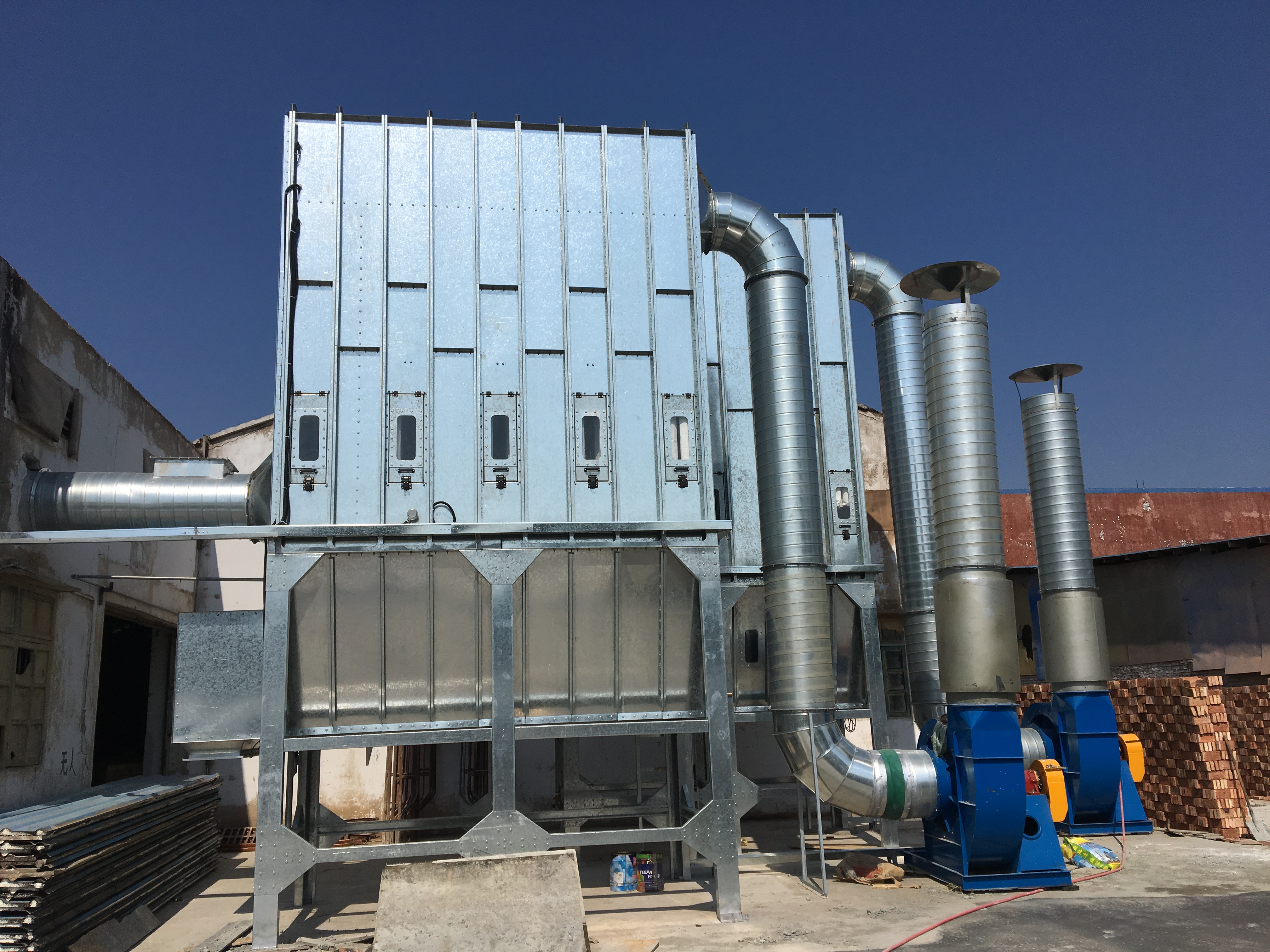 根據(jù)車間設(shè)備布置情況,由于木工機(jī)械吸塵口所需的風(fēng)量及風(fēng)壓、風(fēng)速要達(dá)到要求,并預(yù)留一些風(fēng)量,因此我們采用過濾能力較強(qiáng)脈沖袋式除塵器,匹配相應(yīng)的排塵風(fēng)機(jī),達(dá)到最佳吸塵效果。
