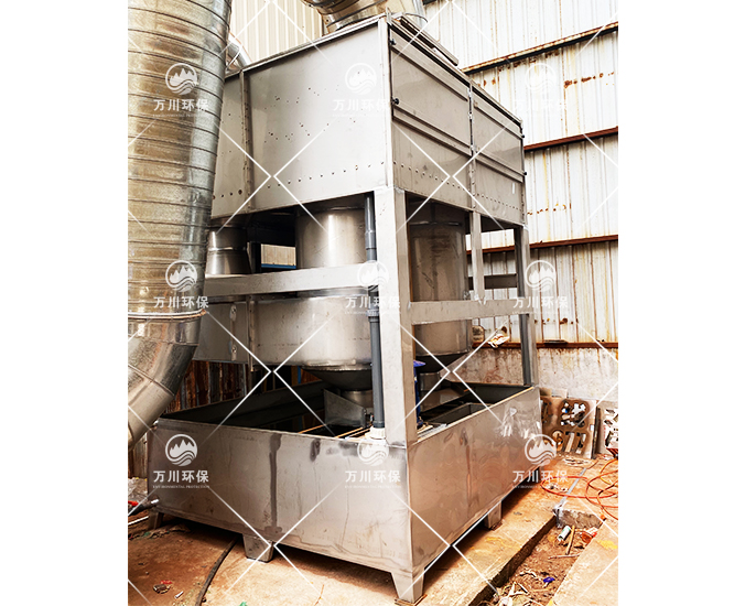 噴淋塔是一種效率高、壓力損失較低的除塵設(shè)備。廢氣正面切向進(jìn)入至內(nèi)部的噴淋層,通過(guò)水洗、噴淋、過(guò)濾后漆霧(在循環(huán)水中加入漆霧絮凝劑,使得油性漆霧在水中的溶解性更大)。