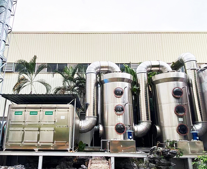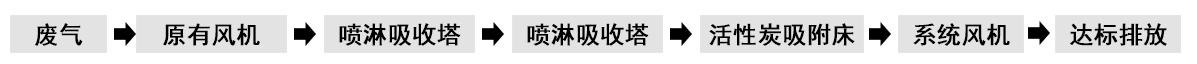 根據客戶需求和我司實地考察之后,最終采用‘兩級噴淋吸收法+活性炭吸附法’對其進行處理。采用水噴淋一方面可以降溫,另一位方面能夠讓水吸收一部分的有機廢氣,降低后續活性炭吸附的負荷。